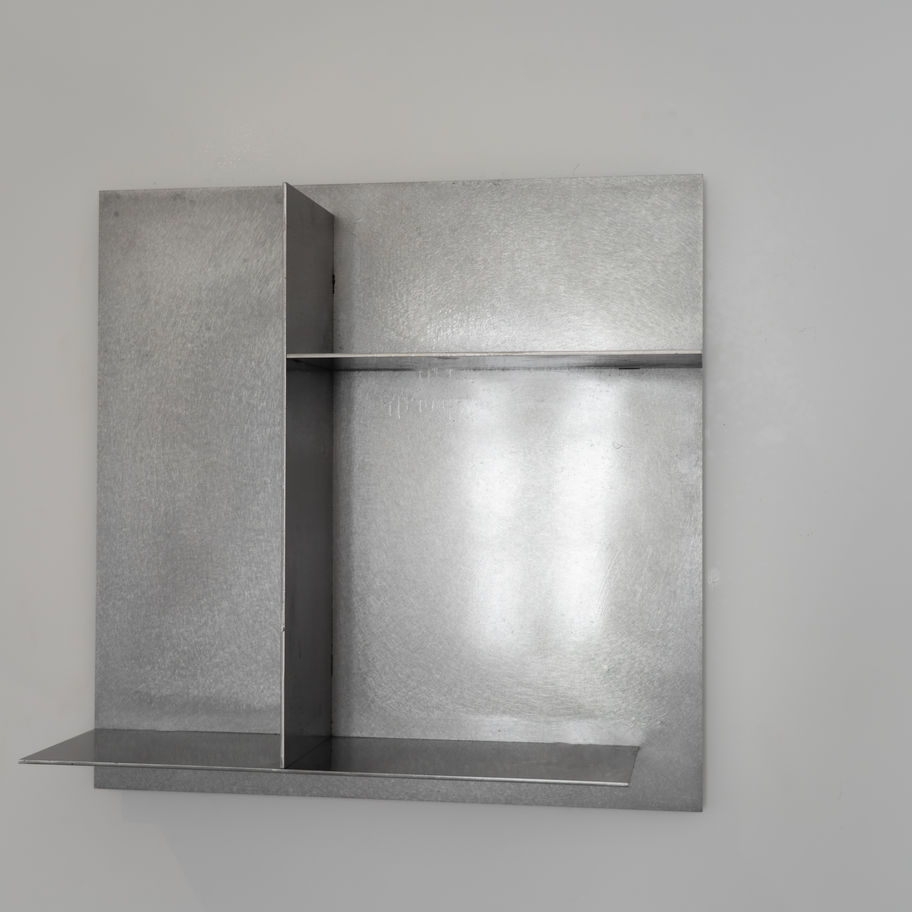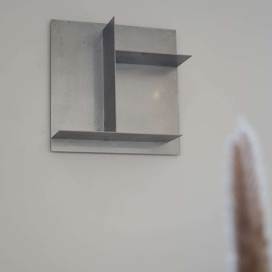 Cette étagère en inox structurée met en valeur la matière brute et raffinée de l’inox vibré.